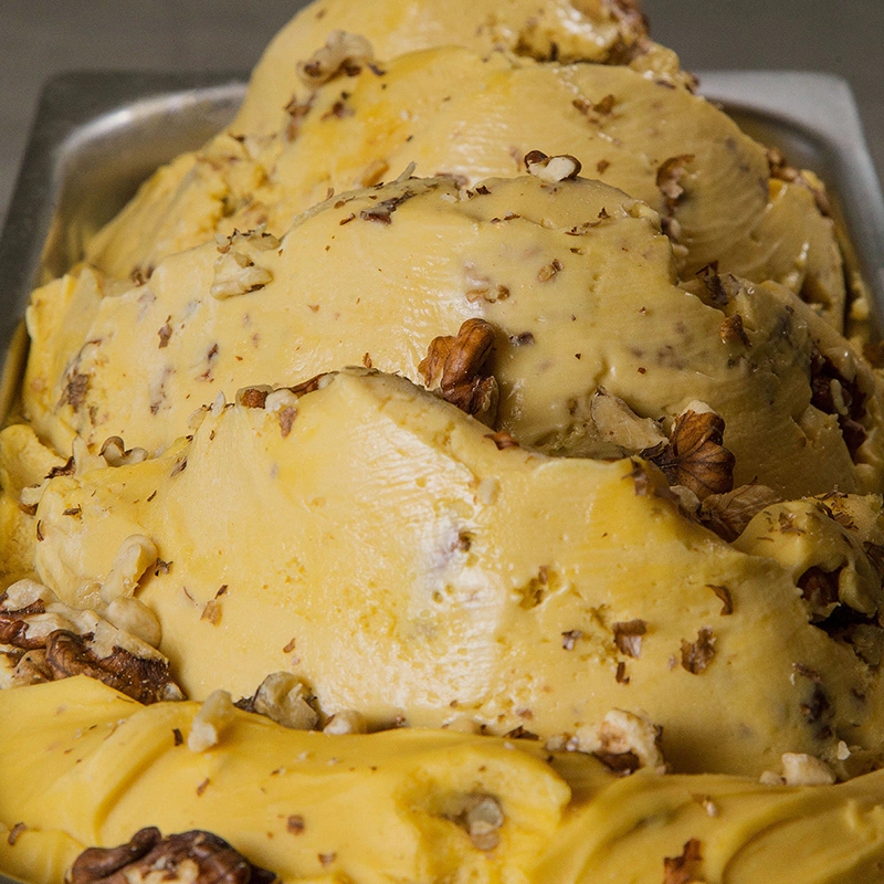 Helado de crema a base de yemas de huevo yvino Marsala, con nueces crocantes.