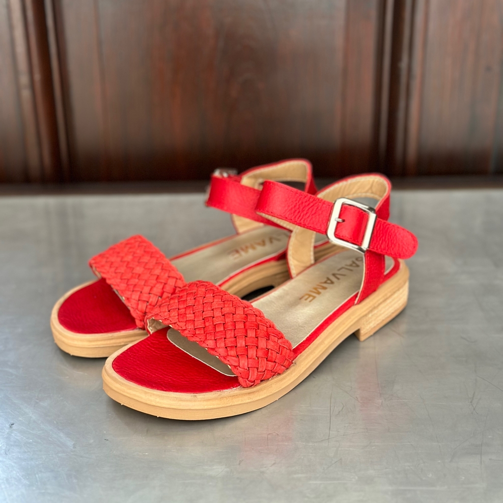 Sandalias en cuero rojo con faja trenzada y hebilla lateral.
