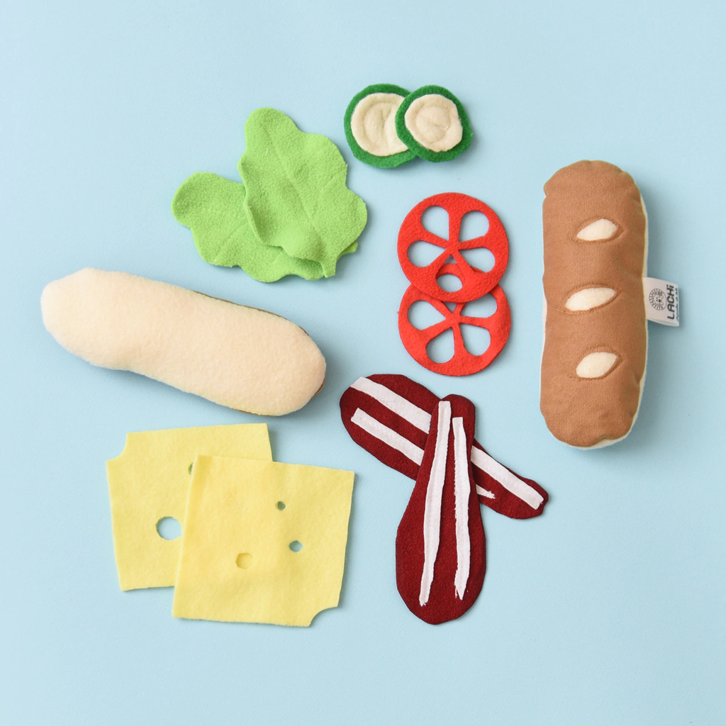 Que más divertido que un sandwich de tela, que se puede armar mil veces, ¡y hacer combinaciones infinitas!Yo te preparo uno a vos, y despues vos a mi, y si escondemos algo sorpresa en el medio, eso es jugary estos juguetes son 100% juego.Te dejo un tip, si llevas el pan lactal (que lo encontrás en la categoria de llevalos por unidad, amplias la propuesta)CONTIENE2 fetas de queso2 fetas de jamón crudo2 rodajas de tomate2 rodajas de pepino2 hojas de lechuga.Todos los detalles, estan cosidos, y son 100% de tela, rellenos de vellon siliconado, el de mejor calidad, que hace que no pierda la forma.Todo es lavable. Son super livianos.Vienen en una bolsita de lienzo para reutilizar, porque no queremos que el packaging se transforme en basura.
