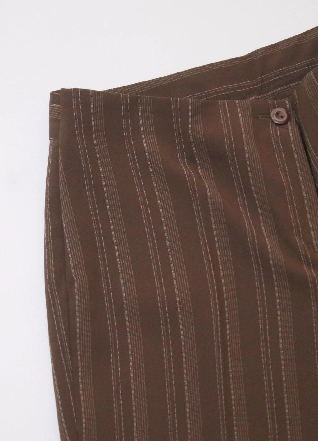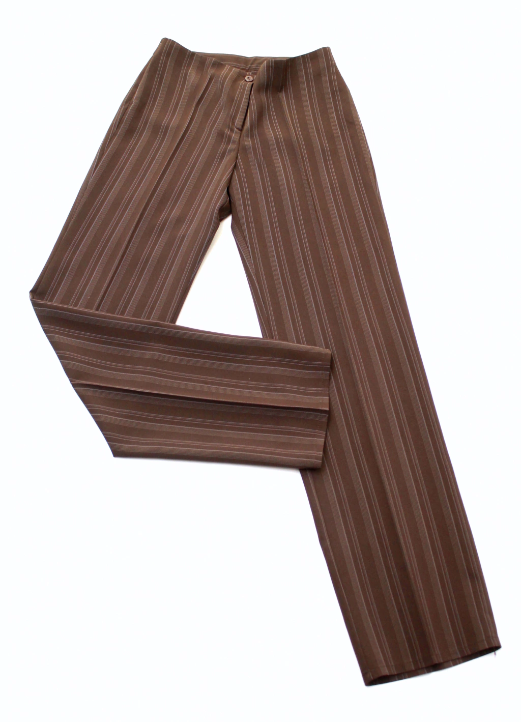 Pantalón sastrero rayado color chocolate, de tela liviana, recto, rígido, tiro medio, NUEVO, fabricado en los años 90s.Medidas talle 36 (en etiqueta dice talle 42):68 cm de contorno cintura96 cm de contorno cadera24 cm de tiro delantero82 cm de largo de pierna (desde entrepierna a botamanga)Medidas talle 38 (en etiqueta dice talle 44):72 cm de contorno cintura100 cm de contorno cadera25 cm de tiro delantero82 cm de largo de pierna (desde entrepierna a botamanga)Medidas talle 42 (en etiqueta dice talle 48):80 cm de contorno cintura106 cm de contorno cadera27 cm de tiro delantero82 cm de largo de pierna (desde entrepierna a botamanga)Importante!Los talles sonAPROXIMADOS, guiarse por las medidas para una mayor exactitud.Tener en cuenta que los talles de antes eran diferentes a los actuales: solían ser un poco más chicos de cintura.Ver info para tomar medidas más abajo.Por dudas y consultas escribinos, gracias!