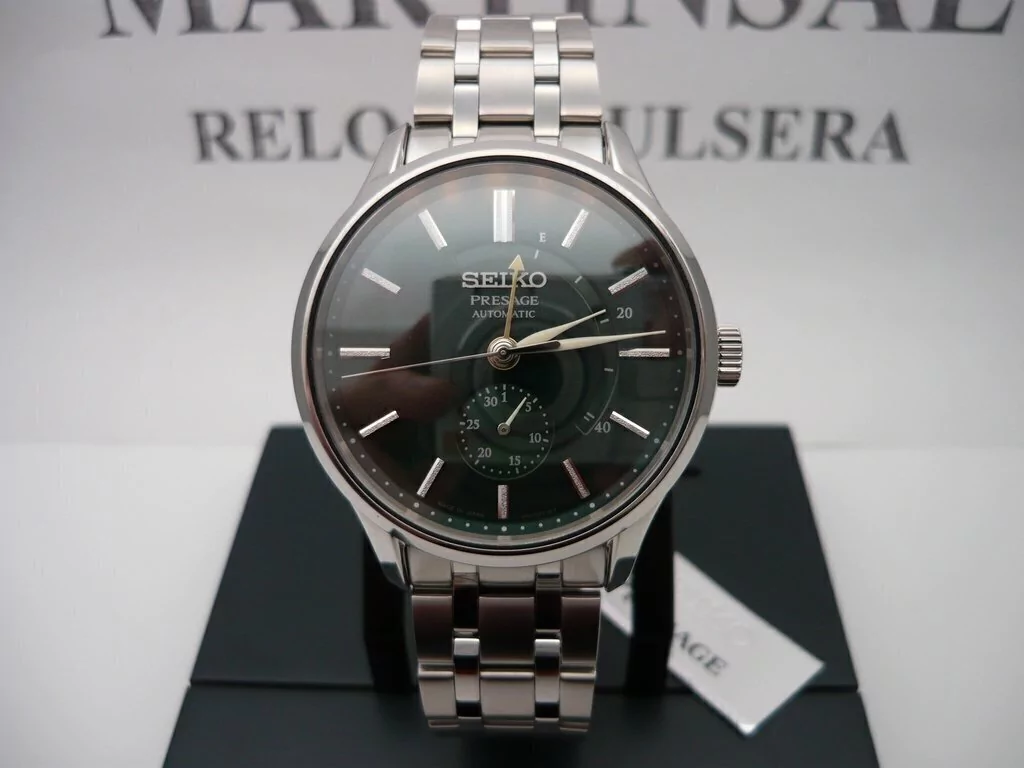 MARTINSAL RELOJESFOTOS REALES DEL RELOJ A LA VENTARELOJES ORIGINALES Y NUEVOS----------------------------------------SEIKOPRESAGEAUTOMATICOSSA397J1MADE IN JAPANNUEVO100% ORIGINALPACKAGING SEIKO OFICIALGARANTIA OFICIAL 1 AÑO SEIKO ARGENTINACaracteristicas del Reloj:Modelo fabricado, ensamblado y calibradototalmente en JaponReloj de: HombreMovimiento: Seiko Calibre 4r57 29 Jewels mecanico automáticocon capacidad de cuerda manual y parada de segunderoReserva de marcha: aproximadamente 41 horasCronografo: NoOtras funciones: Aguja indicadora de reserva de cuerdaCuadrante de color: verdeCristal: ZafiroCorona: Sin roscaCalendario: Subdial con fecha a las 6Agujas y marcas: Sin luminosidadBisel Función: FijoTapa trasera: EnroscadaHermeticidad: Hasta una presion de 5 BarMaterial de la Caja: Acero inoxidableMaterial del bisel: Acero inoxidableMaterial de la malla: Acero inoxidableDiámetro de la caja: 42 mm sin coronaDiametro de la caja: 44,5 mm incluida coronaEspesor de la caja del reloj: 14.1 mmAncho de asas: 20 mmPeso: 143 Gr.