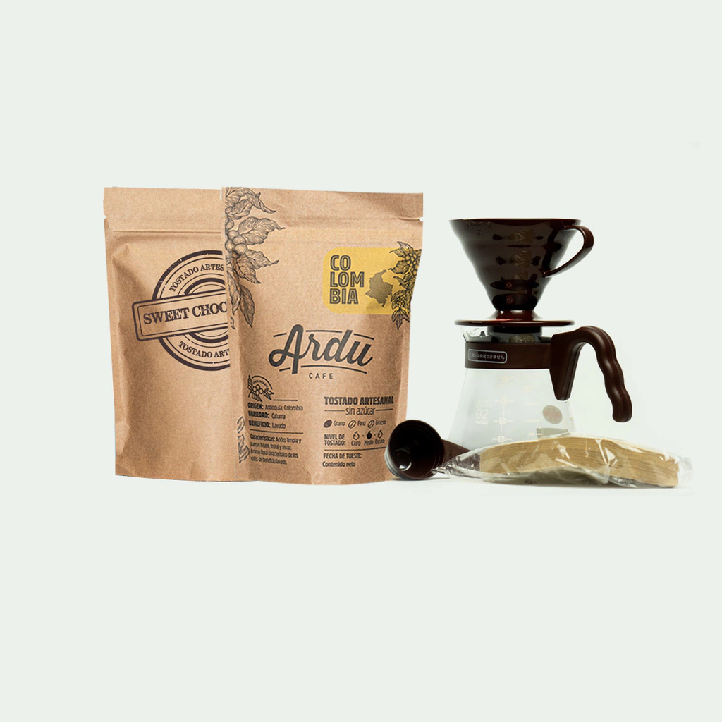 Este combo incluye un dripper V60 Hario Clear y un server V60 Hario Clear, acompañado del mejor café brasilero Caramelo y colombiano, en presentaciones de 250gr.