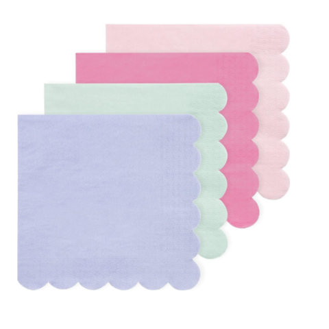 Servilletas de papel color pastel con borde de onditas. Vienen de 10 unidades cada paquete. Miden 12x12cm.