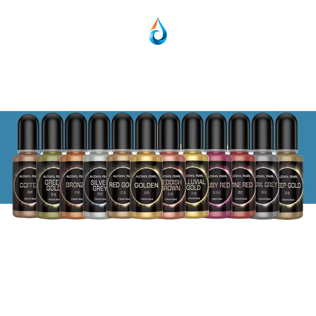 KIT X 12 UNIDADES DE TINTAS AL ALCOHOL PARA RESINA EPOXICOLORES:1-GREEN GOLD2-DEEP GOLD3-REDDISH BROWN4-DARK GREY5-RED GOLD6-ALLUVIAL GOLD7-COFFEE8-BRONZE9-WINE RED10-GOLDEN11-SILVER GREY12-RUBY RED