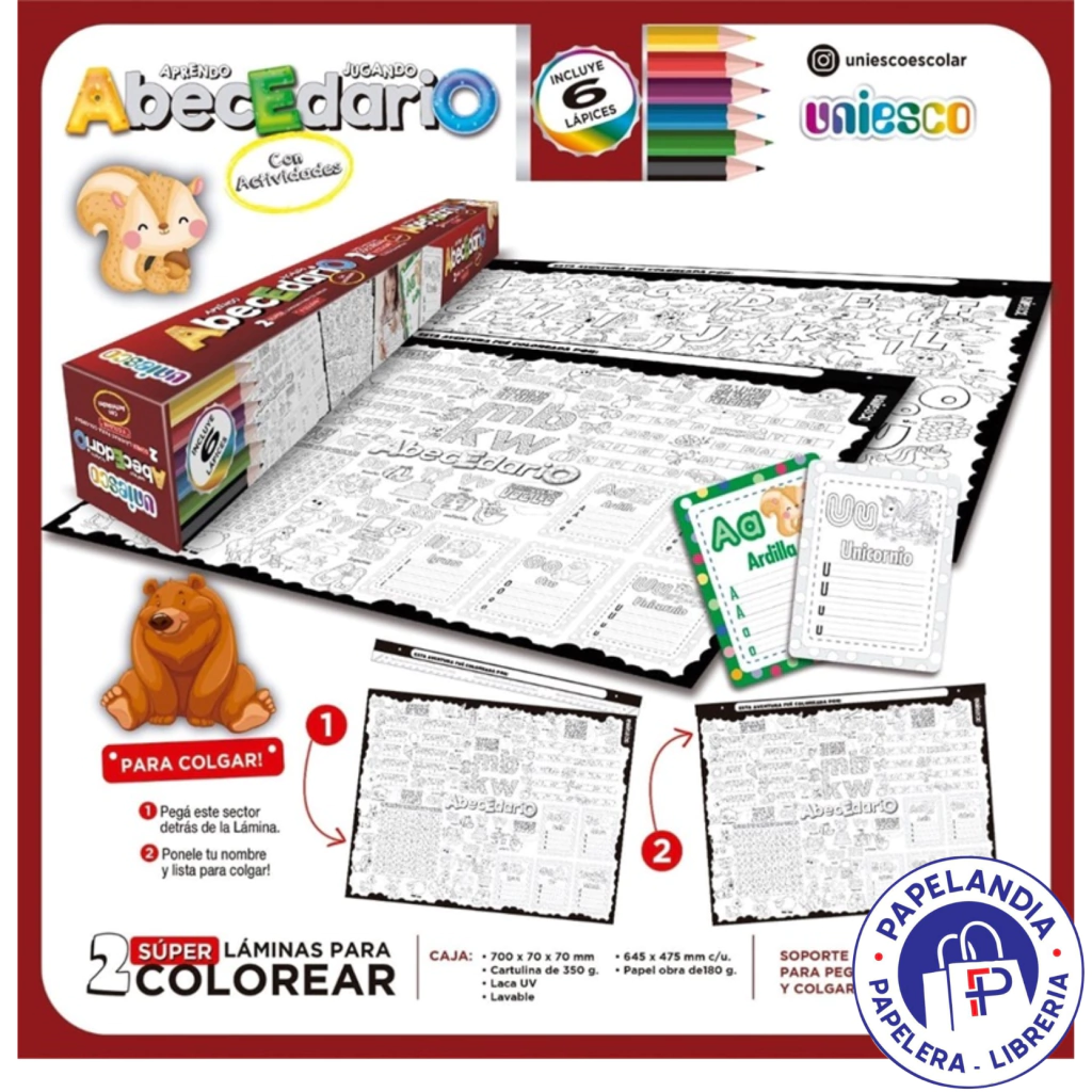 ¿Por qué elegir nuestro SET 2 LAMINAS PARA PINTAR Y COLGAR UNIESCO? Este producto no solo es entretenido, sino que también estimula el aprendizaje en un ambiente lúdico. Ideal para actividades en el aula o en casa, cada lámina será una inspiración para los niños y una manera divertida de aprender el abecedario.