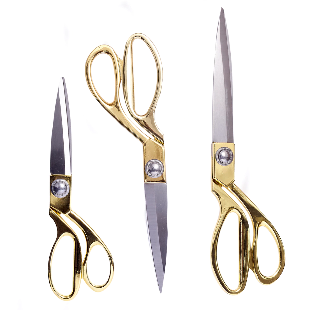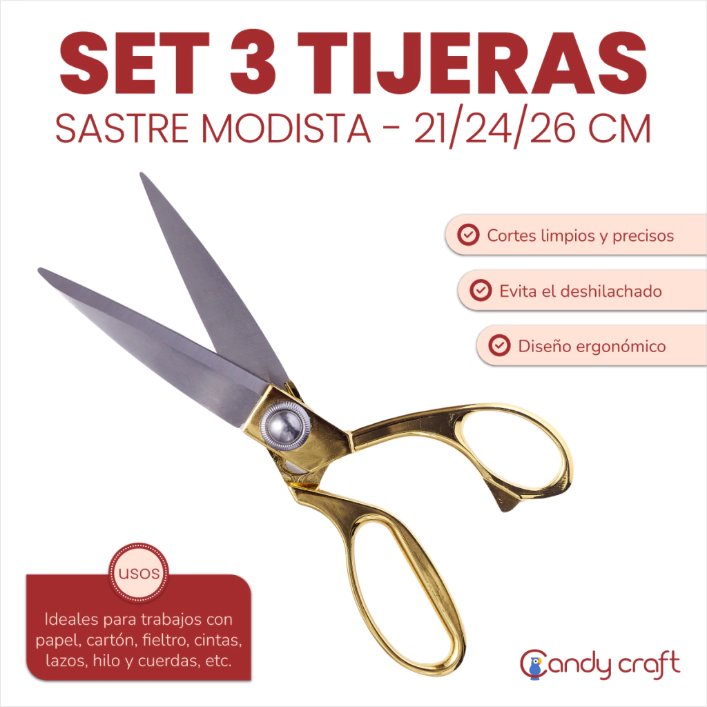 Set 3 Tijeras de Sastre Modista Corta Tela. Tamaños incluidos: 21cm, 24cm y 26cm. Una tijera de sastre se utiliza principalmente en la industria de la confección y la costura. Su diseño especializado y sus características distintivas la hacen adecuada para una variedad de tareas relacionadas con la manipulación de tela. Algunos usos comunes de una tijera de sastre son: