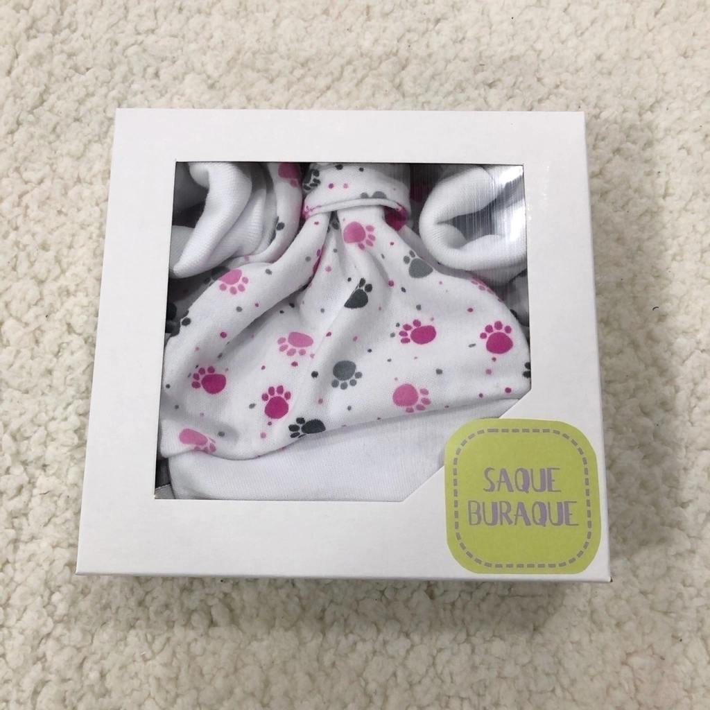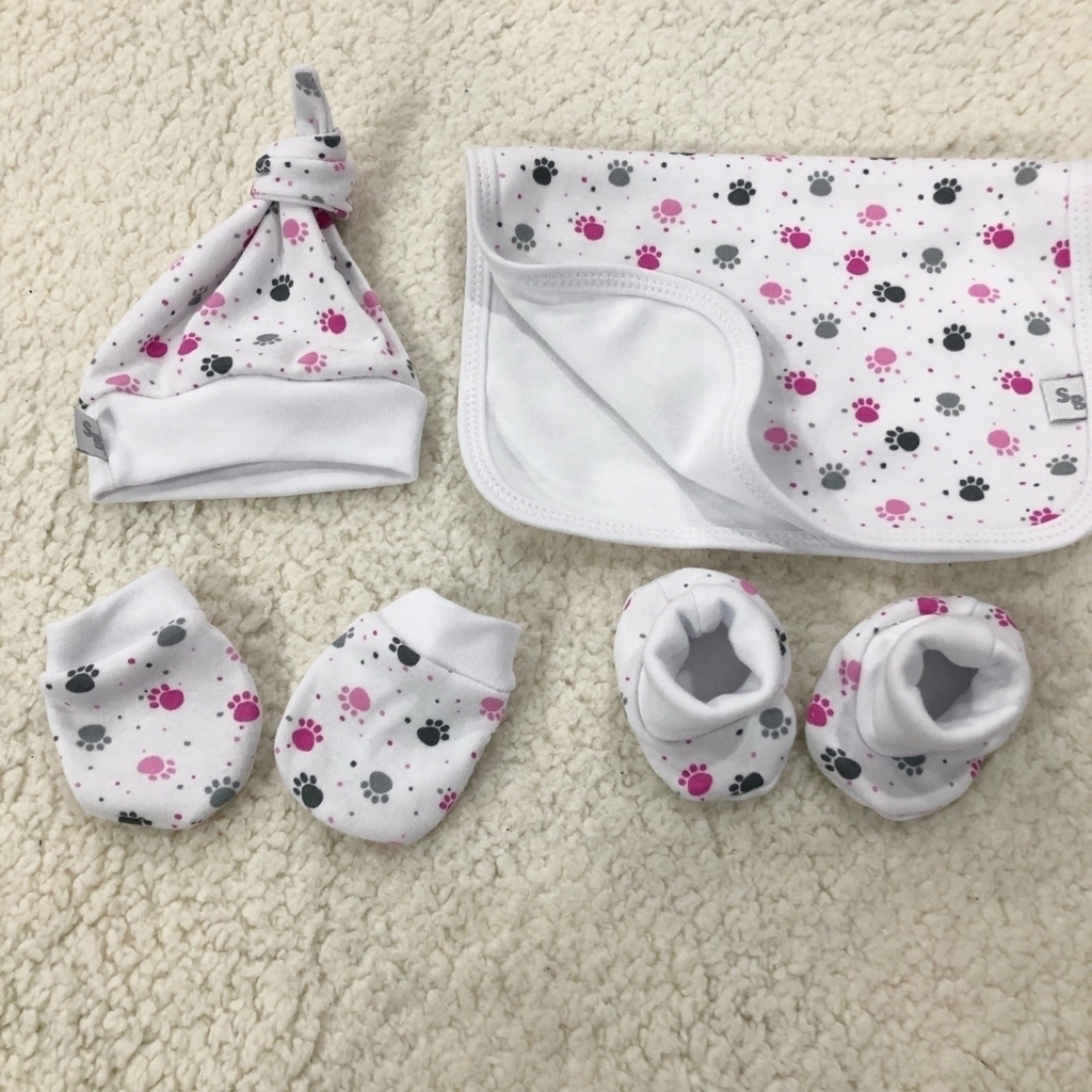 Descripción: Set 4 piezas. Zapatitos de tela, gorro con nudo , babita doble y mitones. Incluye caja.