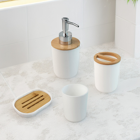 Descripción:Dale a tu baño orden y estilo con nuestro set de baño Teshio de 4 piezas con tapa de bambú natural! Este set incluye un dispensador para tu jabón líquido favorito, una jabonera para mantener tu jabón en barra al alcance, y 2 vasos contenedores con un práctico divisor de bambú. Simplemente llena el dispensador con tu jabón o crema preferido, coloca tu jabón en la jabonera con drenaje para tenerlo siempre prolijo, y usa los vasos contenedores para guardar tus cepillos o accesorios de baño. ¡Transforma la experiencia de tu baño con este set funcional!Características:Modelo: TESHIOMateriales: polipropileno y bambúColores: cuerpo blanco / bambú naturalMedidas:- Dispenser de jabón 7,5 cm × 16,5 cm- Portacepillos 7,5 cm × 11,3 cm- Vaso 7,5 cm × 10,3 cm- Jabonera 13,6 cm × 8,5 cm × 2 cmIncluye:1 SET DE 4 PIEZAS TESHIO