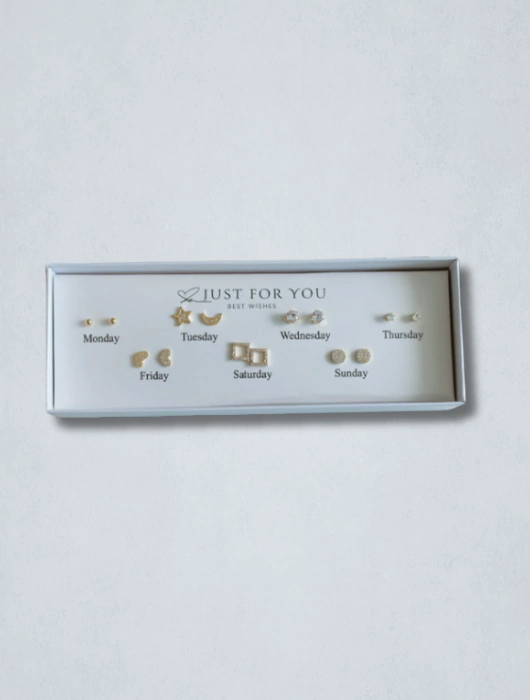 Set de 7 aros para cada día de la semana de cuadradito con cubic son de acero quirúrgico con baño dorado