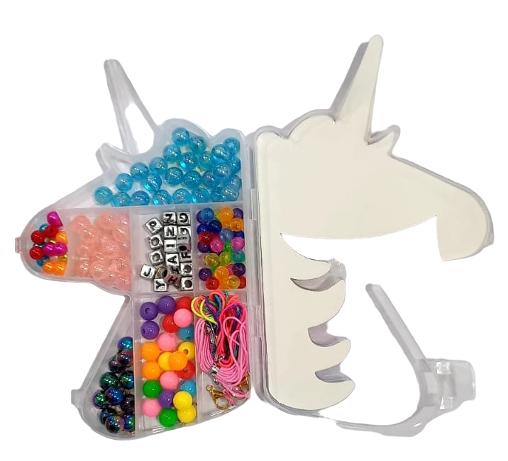 SET BIJOU UNICORNIO54936SebigusSet para armar pulseras y collares con canutillos, mostacillas, ganchitos e hilo-Caja contenedora con forma de unicornioMedidas: 15 x 7.5 x 2 cm
