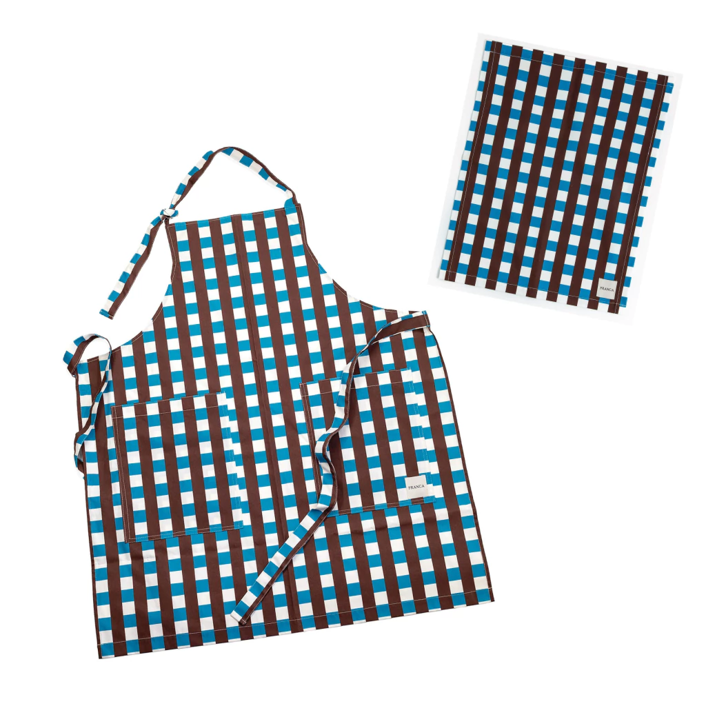 Set de delantal de cocina haciendo juego con paño de cocina, ambos con ESTAMPA PROPIA DE LA MARCA a cuadros color turquesa cyan y marrón chocolate.