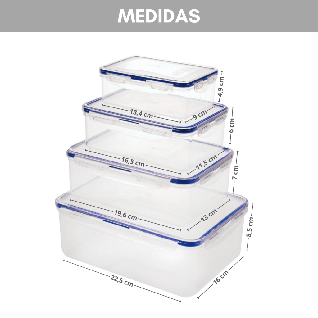 El set incluye 4 contenedores de diferentes tamaños, asegurando versatilidad en su uso.