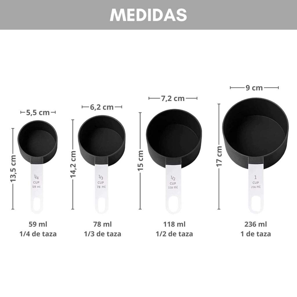 Hechas de plástico apto para alimentos, garantizando seguridad y durabilidad. Cada taza cuenta con un mango de acero inoxidable para un agarre cómodo, grabado con las medidas estándar en tazas y ml, lo que asegura que las medidas no se borren con el uso.