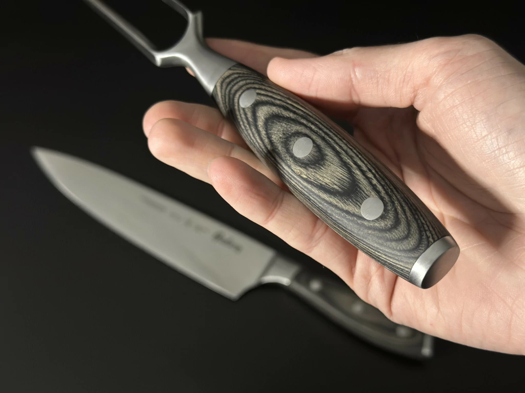 Descripción• Cantidad de piezas2• MaterialAcero Inoxidable• LíneaBBQINCLUYE:-1 Trinchador Parrillero: Largo Total 31 cm | Largo Tenedor 18 cm | Ancho 2,8 cm | Mango Madera | Cuerpo Acero Inoxidable-1 Cuchillo Parrillero: Largo Hoja 20 cm (8") | Ancho Hoja 4,5 cm | Largo Total 34 cm | Mango Madera | Hoja de Acero Inoxidable X30Cr13-Caja de PresentaciónEste set fue diseñado para lograr una agradable experiencia de corte durante su uso en parrilla, teniendo en cuenta el perfecto balance entre robustez y precisión.TIPS PARA CUIDAR LOS CUCHILLOSCuidar un cuchillo de asado es FUNDAMENTAL. Limiparlo y conservarlo adecuadamente prolonga la vida util de la hoja. Siempre recomendamos limpiar luego de utilizarlo, evitando dejar dejar demasiado tiempo con restos de comida y en contacto con el aire. Los residuos de los alimentos perjudican la hoja, sea generando manchas o afectando su filo y por lo tanto, minimizando la efectividad del corte.Limpiar pasando paño humedo por la hoja; puede complementar esta acción lavando solamente con agua fría, esponja y detergente no abrasivo.EVITAR LAVAVAJILLAS! Tampoco deje en agua por largo período de tiempo. El exceso de contacto con agua caliente aumenta el riesgo de dañar mangos, hojas y filos.Secar con suavidad, sin dejar gotas ni rastros de humedad. Guardar en sitio adecuado.