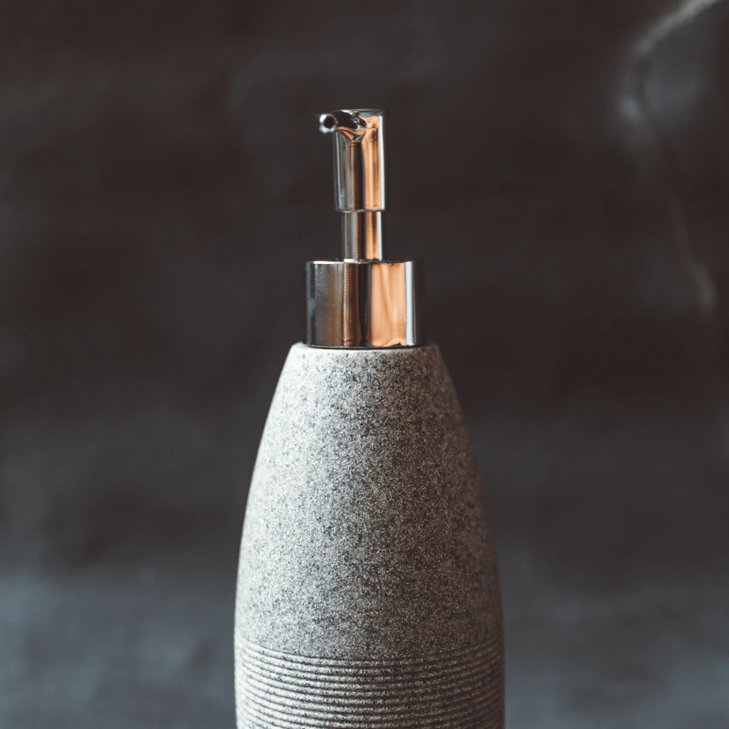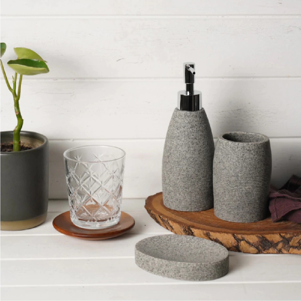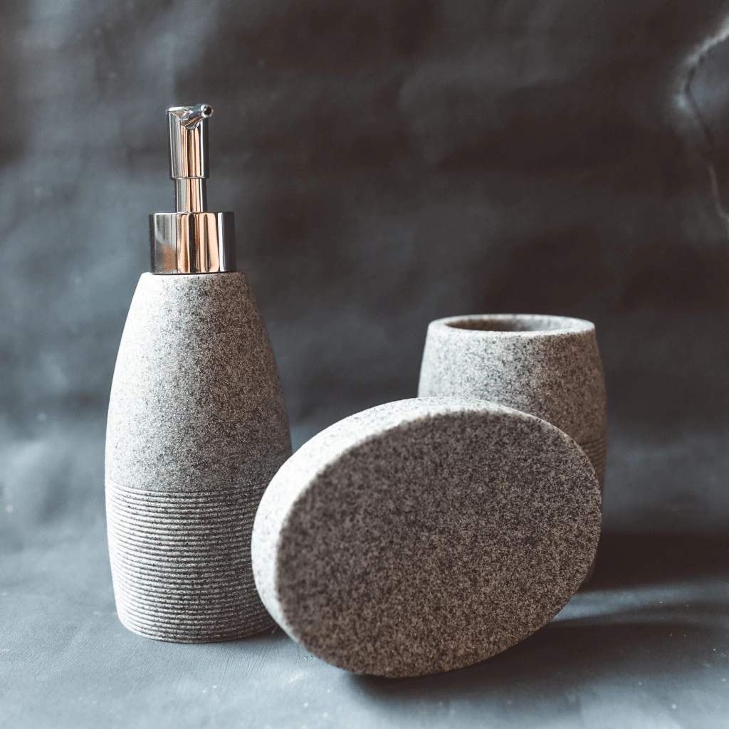 Set de baño de 3 piezas de resina color gris piedra. Incluye vaso, jabonera y dosificadorSuper resistente y de facil cuidado.