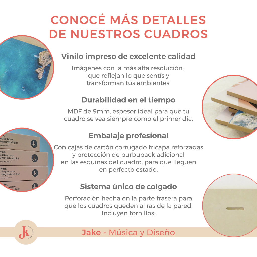 Transformá tus espacios con nuestros sets de cuadros♥Creá un ambiente ideal para trabajar de forma eficiente, para descansar de manera más relajada o simplemente para agregarle alegría y armonía a tu hogar.•Diseños en vinilo de excelente calidad de impresión, con imagenes de alta resolución.Cómo están fabricados los cuadros SIN MARCO?•Confeccionados enMDF de 9mm de espesor, ideal para su durabilidad en el tiempo.•Perforación traserapara que al colgarlos queden perfectamente al ras de la pared. (Incluyen tornillos)Cómo están fabricados los cuadros CON MARCO?•Creados con marco demadera kiride 2cm de espesor y fondo de MDF de 3mm de espesor.•Soportecon serruchoen la parte traserapara que lo puedas colgar sin dificultades. (Incluyen tornillos)•Ambos incluyenembalaje profesional, con burbupack y cartón corrugado, para que llegue en perfectas condiciones.Importante:Si el diseño que elegiste tiene contorno blanco, está hecho en vinilo y es parte del diseño. Si lo querés con o sin ese contorno, lo podés aclarar luego de realizar la compra.Cuándo voy a recibir mi compra?El tiempo de preparación es de 3 a 5 días hábiles, desde que realizaste la compra. Una vez despachado, demora entre 2 y 6 días hábiles en llegar a tu domicilio, dependiendo de la zona del país donde vivas.