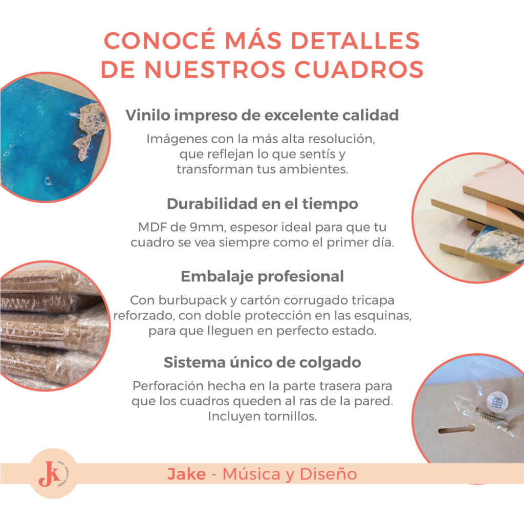 Transformá tus espacios con nuestros sets de cuadros♥Creá un ambiente ideal para trabajar de forma eficiente, para descansar de manera más relajada o simplemente para agregarle alegría y armonía a tu hogar.•Diseños en vinilo de excelente calidad de impresión, con imagenes de alta resolución.Cómo están fabricados los cuadros SIN MARCO?•Confeccionados enMDF de 9mm de espesor, ideal para su durabilidad en el tiempo.•Perforación traserapara que al colgarlos queden perfectamente al ras de la pared. (Incluyen tornillos)Cómo están fabricados los cuadros CON MARCO?•Creados con marco demadera kiride 2cm de espesor y fondo de MDF de 3mm de espesor.•Soportecon serruchoen la parte traserapara que lo puedas colgar sin dificultades. (Incluyen tornillos)•Ambos incluyenembalaje profesional, con burbupack y cartón corrugado, para que llegue en perfectas condiciones.Importante:Si el diseño que elegiste tiene contorno blanco, está hecho en vinilo y es parte del diseño. Si lo querés con o sin ese contorno, lo podés aclarar luego de realizar la compra.Cuándo voy a recibir mi compra?El tiempo de preparación es de 3 a 5 días hábiles, desde que realizaste la compra. Una vez despachado, demora entre 2 y 6 días hábiles en llegar a tu domicilio, dependiendo de la zona del país donde vivas.