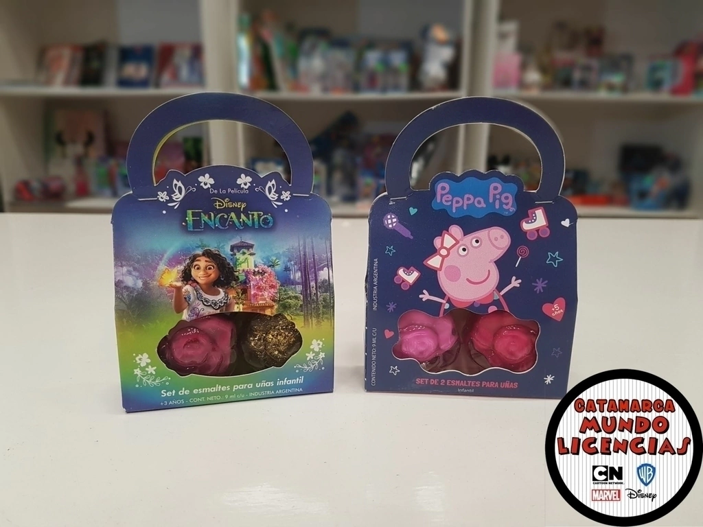 Kit carterita con dos esmaltes de diferentes colores.Motivos:Peppa PigEncanto (Disney)Los colores de los esmaltes pueden variar a los de las fotos. Consulte antes de comprar.