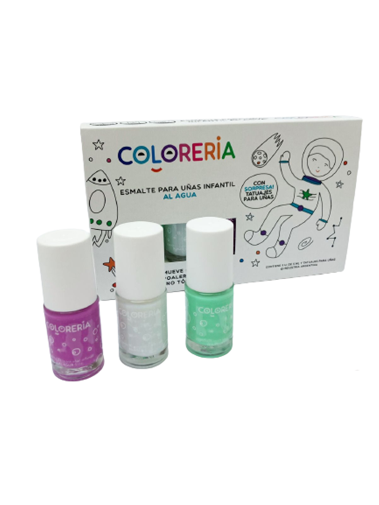 3 esmaltes de 5ml + tatuajesesmaltes de uñas infantilELABORADOS a base de aguase remueven con aguahipoalergénicos y no tóxicosINCLUYEN TATUAJES LAVABLES