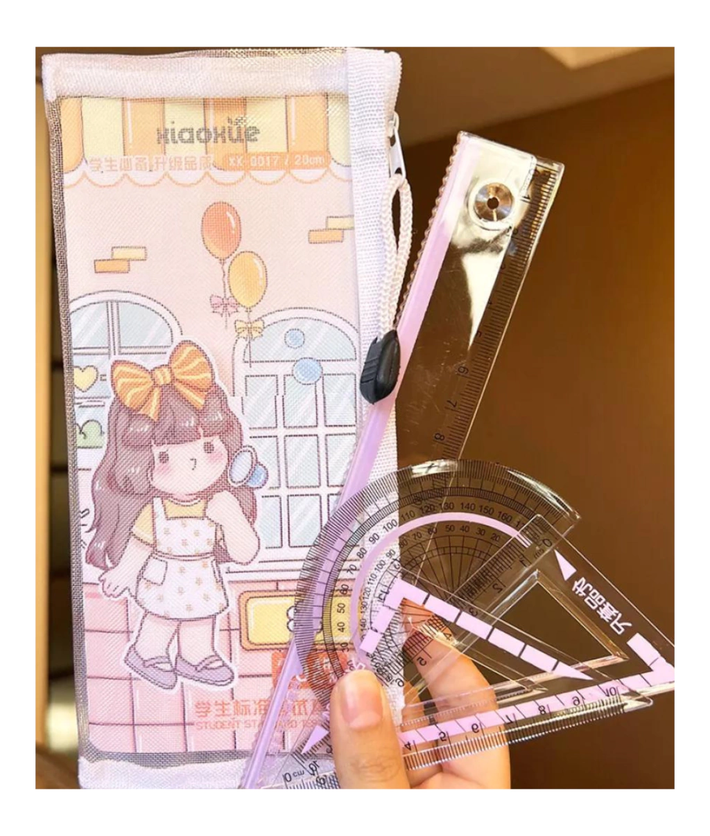 Set de geometría con cartuchera.Incluye transportador, regla, escuadra y cartuchera.Las fotos son ilustrativas.