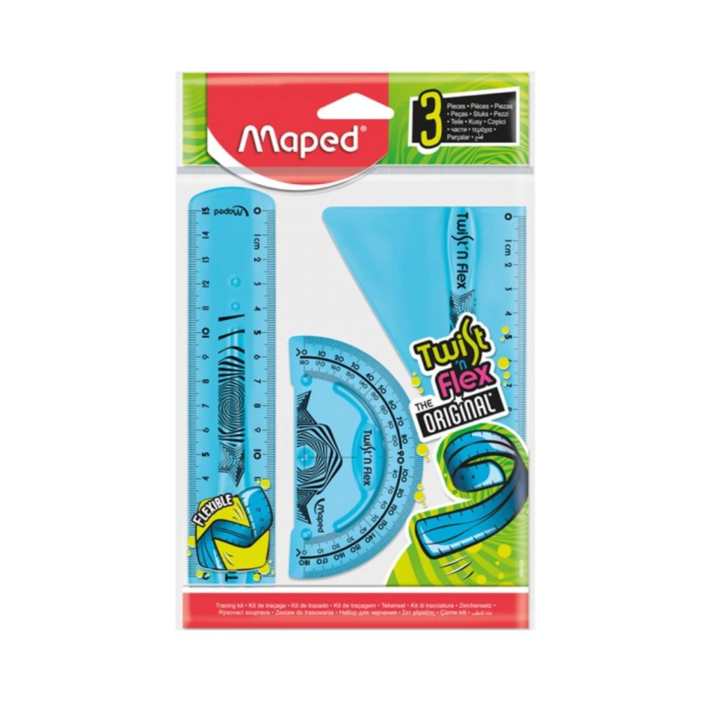Set de 3 piezas Maped flexible, irrompible y lúdico!Incluye: 1 regla de 15cm, 1 escuadra 60° 15 cm, 1 transportador 180° 10 cm.Disponible en azul, verde y rosa. (Elección de color a convenir al finalizar la compra)