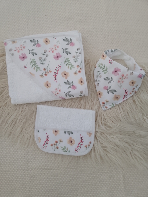 Set compuesto por:Toallón con capucha ( toalla doble felpa ). Tamaño : 75 cm x 75 cmBabita: Toalla doble felpa con guarda de diseño. Tamaño : 20 x 30 cmBabero bandana