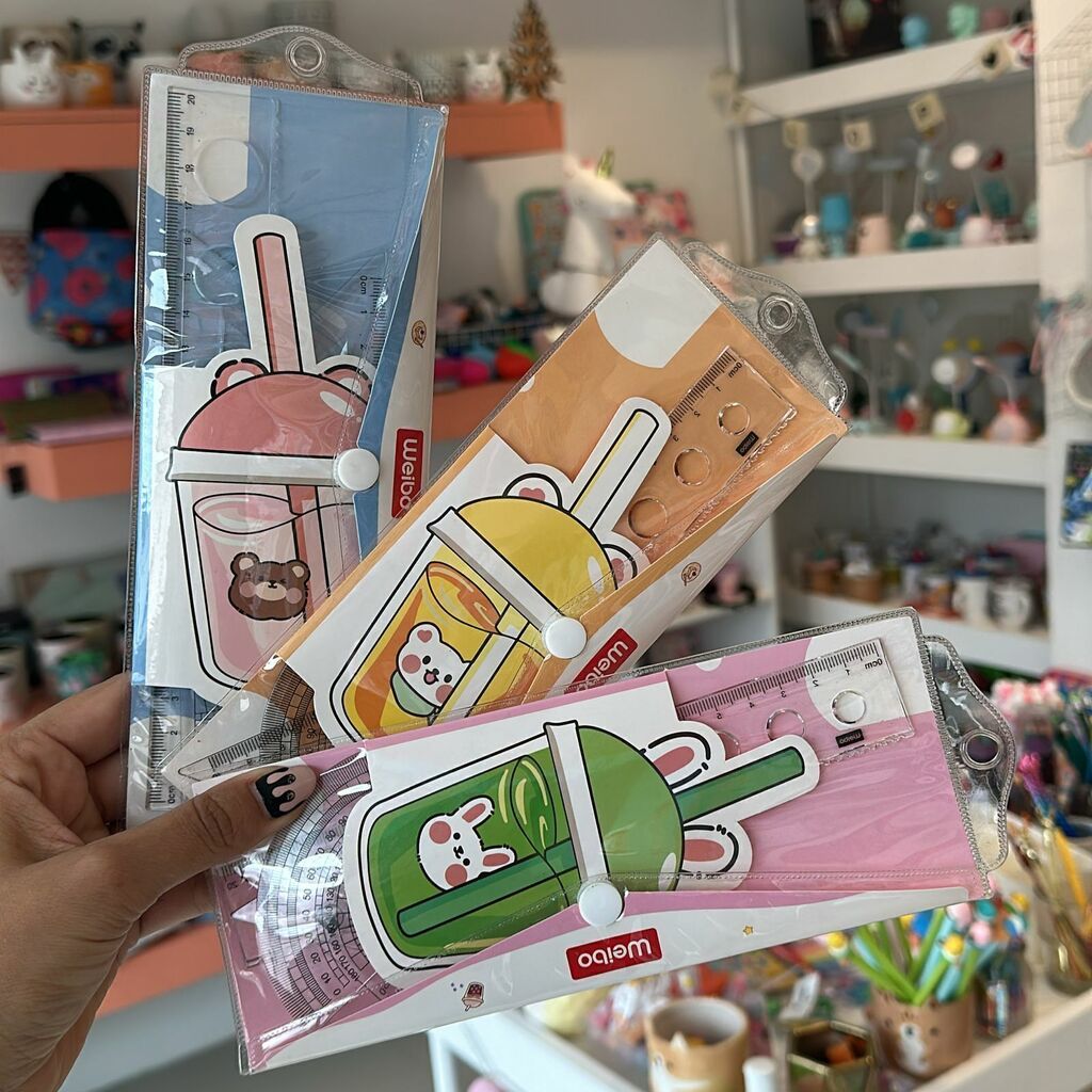 El set incluye:Mini escuadra de 45° (10 cm de larga)Mini escuadra 30° (10 cm de larga)Transportador (9,5 cm de largo)Regla de 20 cm con marcador de círculos y ondasSobre de pvc con broche