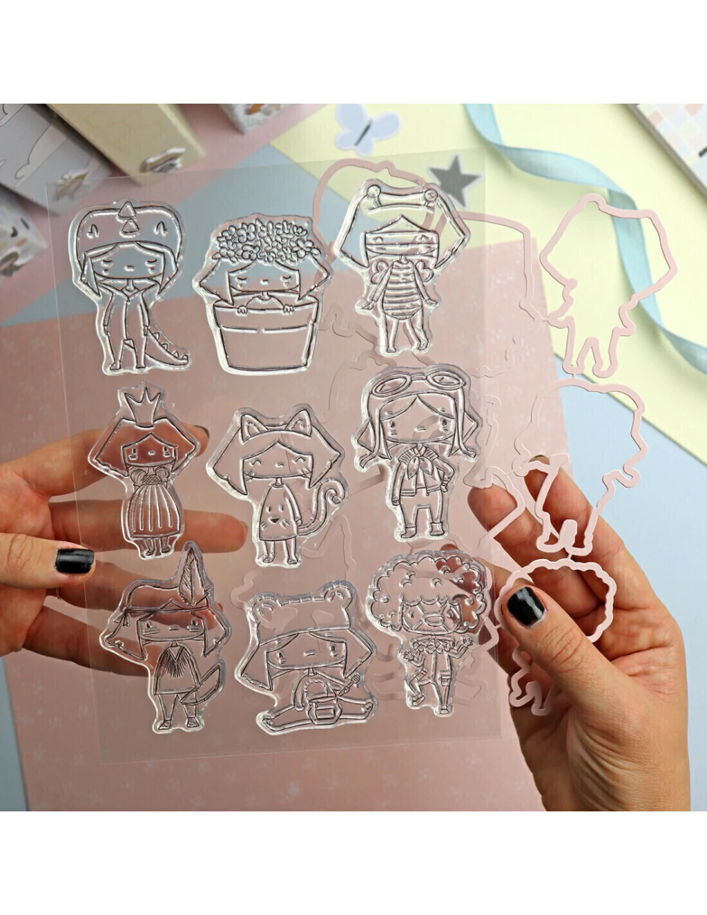 Set de Sello y Troquel.Cantidad: 9 sellos y 9 troqueles (con el contorno de los sellos).Material: fotopolímero y metal.Marca: Alua Cid.