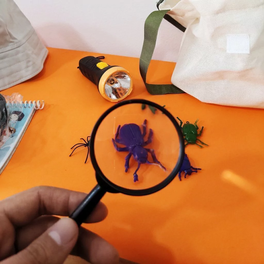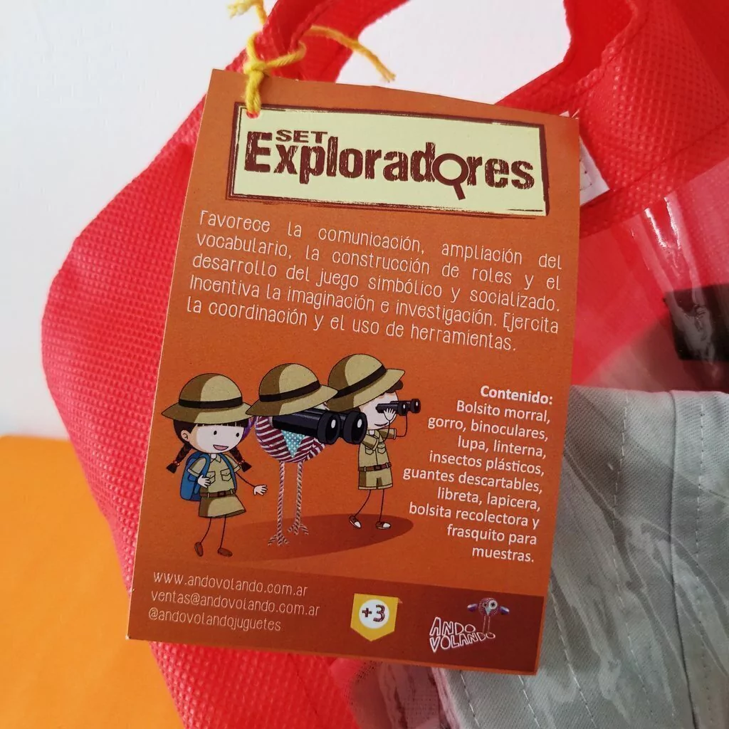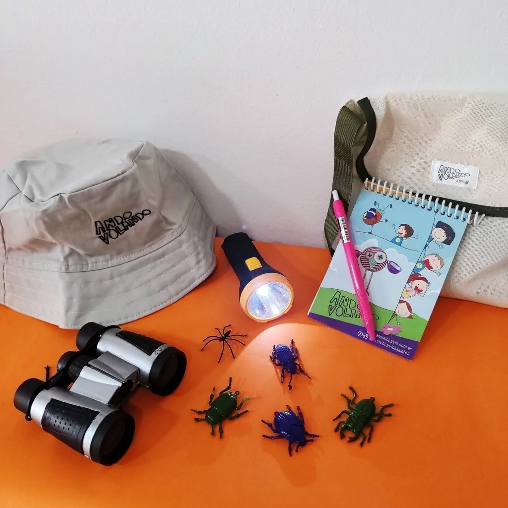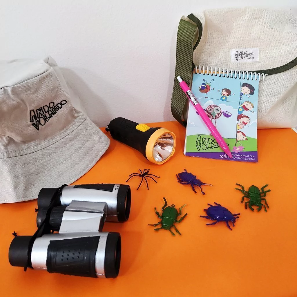 Contenido: Bolsito morral, gorro, binoculares, lupa, linterna, insectos plásticos, guantes descartables, libreta, lapicera, bolsita recolectora y frasquito para muestras.