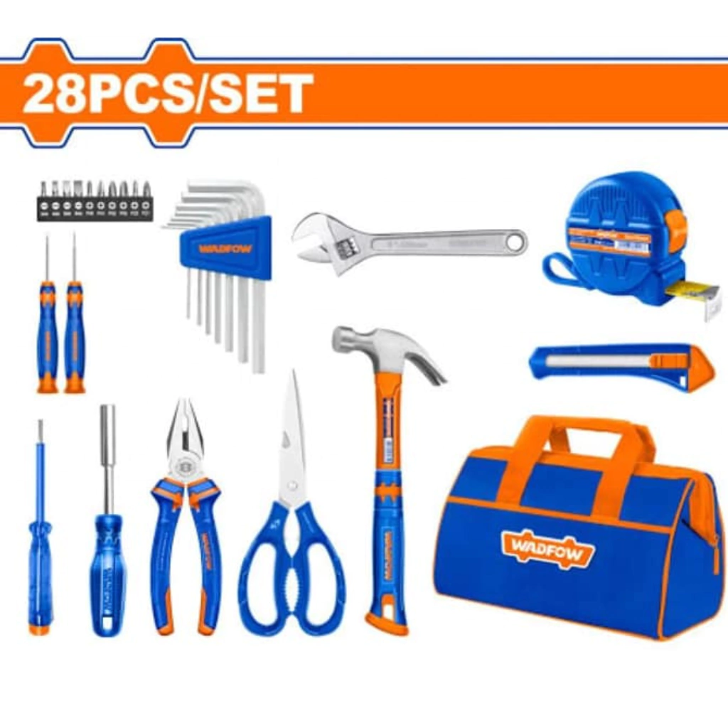 Bolso Juego Set Kit Herramientas Manuales x 28pzs Wadfow WDFWHS1M28Bolso Juego Set Kit Herramientas Manuales x 28pzs Wadfow WDFWHS1M28– 1 Cinta métrica de acero, 3 m * 16 mm.– 1 Alicates combinados de 6″.– 1 Tijera de 8″.– 1 Llave ajustable de 6″.– 1 Navaja de hoja a presión, 100 mm * 18 mm.– 1 Martillo de orejas, 8 oz.– 1 Lápiz de prueba, 140 mm.– 1 Vástago magnético, 1/4″ * 100 mm.– 10 Puntas de destornillador: SL4, SL5, SL6, PH1, PH2, PH3, T10, T15, T20, T30.– Destornillador de precisión de 1 pieza, SL2.0 * 50 mm.– Destornillador de precisión de 1 pieza, PH000 * 50 mm.– 7 Llave hexagonal: 1,5 mm, 2 mm, 2,5 mm, 3 mm, 4 mm, 5 mm, 6 mm.– 1 Bolsa de herramientas, 13″.