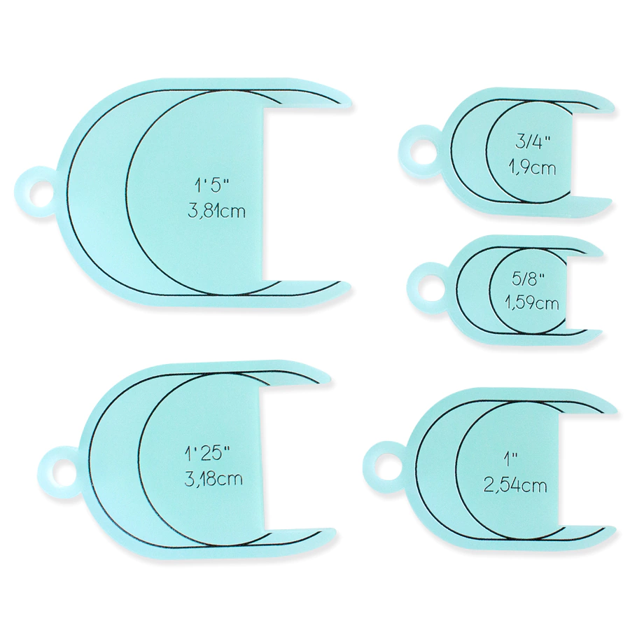 Set de medidores metacrilato translúcido. Con perforación para colgarlos con las cadenitas de Kimidori Colors..Con ellos podrás medír el lomo de tu álbum y saber qué anilla utilizar. Medidas: 1´5" - 1´25"" - 3/4" - 5/8" - 1".