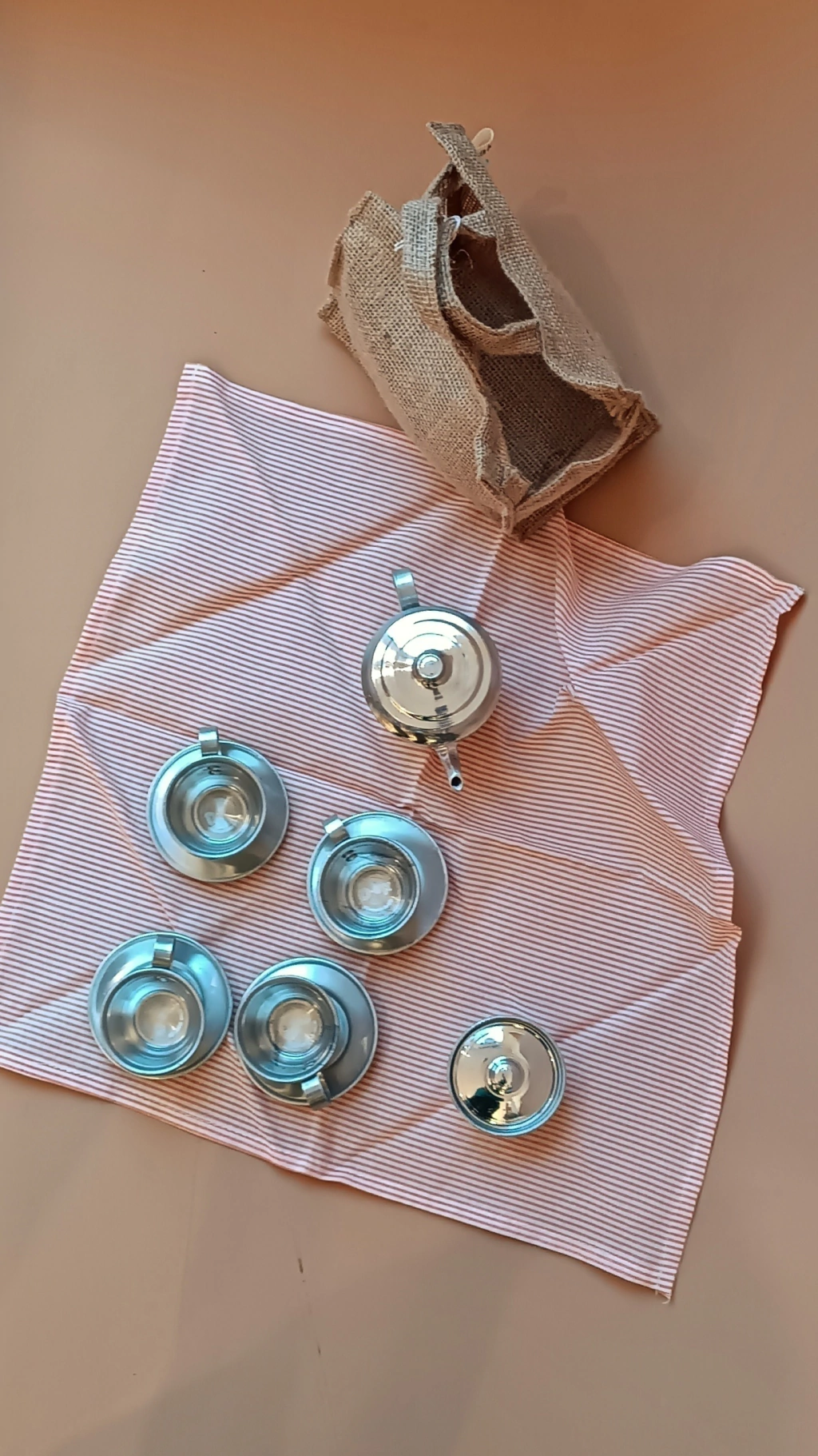 Set de tetera, 4 tazas con platito y mantel. Todo viene en una bolsita de tela arpillera.