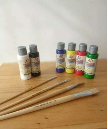 6 pinturas acrílicas + 4 pinceles artísticos pelo cerda chatosEl kit incluye:- 6 acrílicos decorativos, Marca AD, nacionales. Colores: Blanco, Negro, Rojo, Azul, Verde y Amarillo. ( o surtidos a elecciòn)- Set 4 pinceles de cerda, chatos.