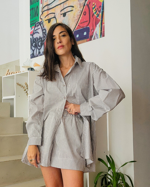Set de maxi camisa y short tipo boxer de algodón camisero. La camisa es oversize con botones a tono y corte redondeando con tajitos laterales. Posee bolsillo grande de un solo lado y cartera con boton en mangas.El short posee elastico en cintura y botoncitos a tono. Bolsillos laterales.Medidas:CamisaTalle 1Espalda: 52cmLargo de manga: 55cmBusto: 58cmCintura: 58cmCadera: 62cmLargo: 78cmTalle 2Espalda: 54cmLargo de manga: 57cmBusto: 60cmCintura: 60cmCadera: 64cmLargo: 80cmShort(Con elastico interno en la cintura)Talle 1Cintura: 32cm (cede hasta 46cm)Cadera: 54cmTiro: 28cmLargo: 38cmTalle 2Cintura: 34cm (cede hasta 48cm)Cadera: 56cmTiro: 30cmLargo: 40cm