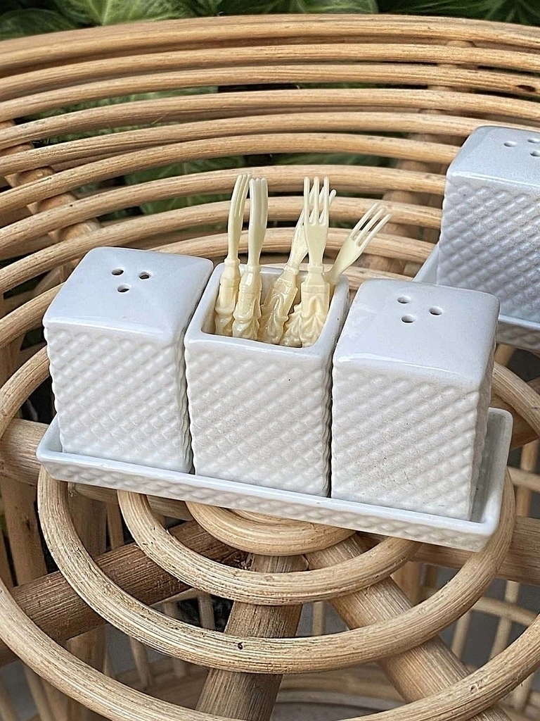 Set de porcelana con frasco salero, pimentero, palillero y plato.