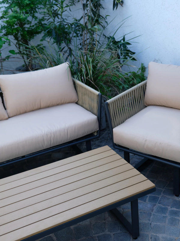 Set Uluwatu! Este conjunto de exterior de 4 piezas incluye dos sillones individuales, un sillón de dos cuerpos y una mesa ratona.