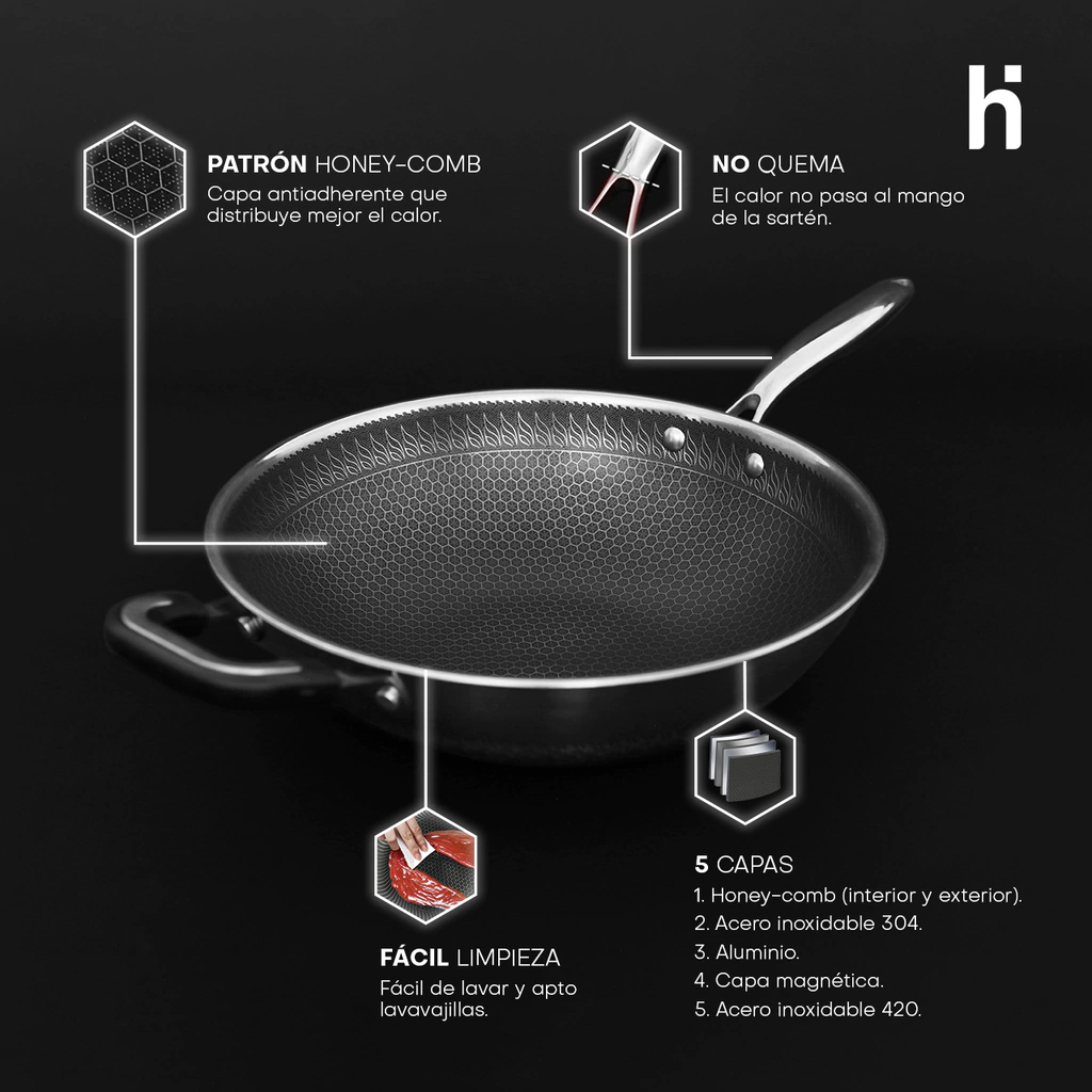 - Wok con tapa de vidrio para mantener el calor