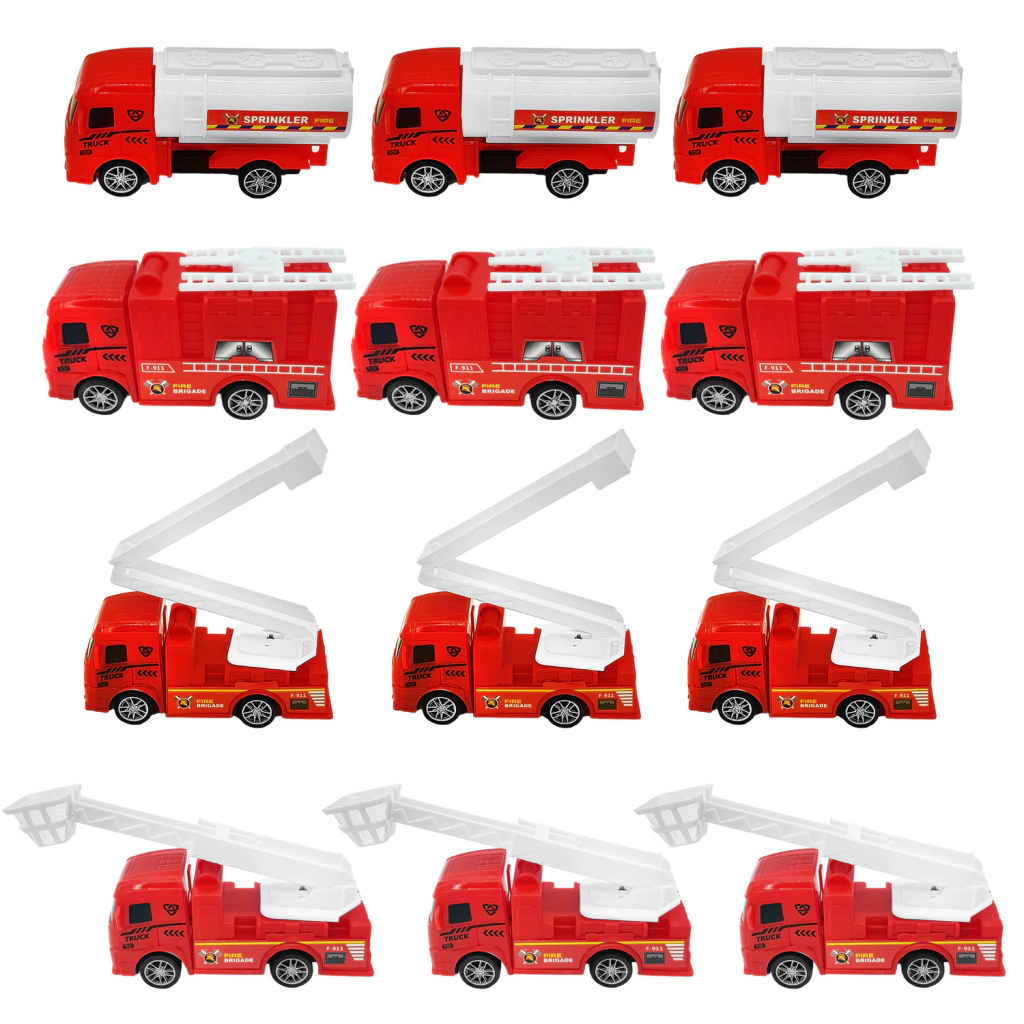 Set x 12 Camiones de Bomberos de juguete a Fricción. LA caja incluye 12 camiones varios para jugar a ser el mejor bombero.Posee 3 Autobomba pesadas, 3 Autobombas 4x4, 3 Vehículos de altura y 3 Vehículos UPI Bombas.A Fricción para jugar sin parar!Modo de transporte: TerrestreModelo: BomberoPara niños mayores de 3 años. Permite el desarrollo de la interacción entre los niños, estimula la imaginación, la comunicación y la capacidad de pensamiento. Desarrolla la curiosidad en los niños para recrear escenas de la vida cotidiana, fomentar la estimulación y la coordinación del niño.En caja. No utiliza pilas.Medidas de la Caja: 35 cm (ancho) x 35 cm (largo) x 4 cm (prof.)Medidas de los camiones: 9 cm (largo) x 3 cm (ancho) x 4 cm (alto)