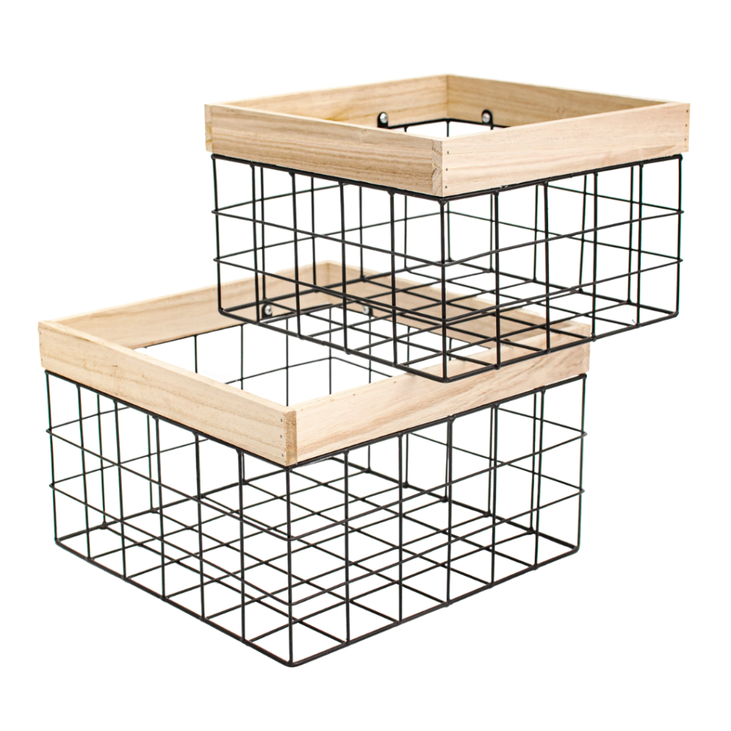 Set x 2 Canastos de Metal con con marco de madera.El set contiene 2 organizadores para guardar papelería de oficina, accesorios de maquillaje, utensilios de cocina y alimentos, artículos de limpieza, artículos de baño, objetos del dormitorio y múltiples usos. También es ideal para decorar espacios como salas de estar, living, dormitorio.Los cestos tienen diferente tamaño:Canasto 1:- Ancho: 33 Cm / Profundidad: 33 Cm / Altura: 20 Cm.Canasto 2:- Ancho: 28 Cm / Profundidad: 28 Cm / Altura: 18 Cm.Material: Metal negro y madera.