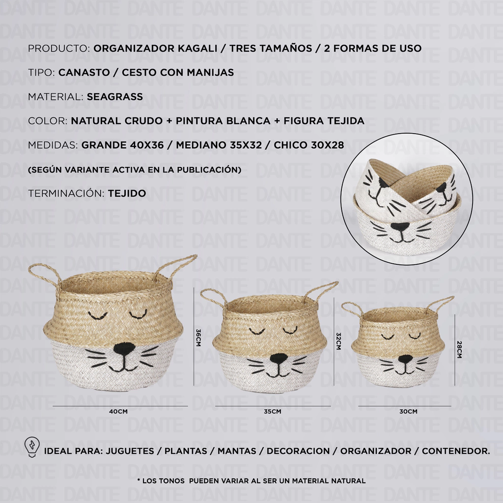 Descripción:Pack x3 de canastos con manijas KIGALI, una solución encantadora y versátil para los más pequeños de la casa. Estos cestos, fabricados en seagrass, combinan resistencia y calidez natural, y añaden un toque de diversión a la habitación de los niños con su pintura blanca y caritas de animalito.Este pack incluye tres tamaños diferentes para adaptarse a las necesidades de almacenamiento de los pequeños. Podés disfrutar de dos formas de uso: mantenerlos abiertos con la manija a la vista para un acceso rápido y sencillo a juguetes y pertenencias, o cerrarlos con la manija escondida para mantener todo ordenado y con un toque de alegría. La terminación tejida a mano garantiza su calidad y durabilidad. Simplificá la organización y decoración del cuarto de los niños con el pack x3 de canastos KIGALI.Caracterísiticas:PRODUCTO: ORGANIZADOR KIGALI / TRES TAMAÑOS cod.: GRUPO1102TIPO: CANASTO / CESTO CON MANIJASMATERIAL: SEAGRASSCOLOR: NATURAL CRUDO + PINTURA BLANCO + FIGURA TEJIDAMEDIDAS: GRANDE 40X36 / MEDIANO 35X32 / CHICO 30X28TERMINACIÓN: TEJIDOPRECIOS POR 3 (tres) CESTOS - GRANDE - MEDIANO - CHICO** DOS FORMAS DE USO **abierto con manija a la vista, cerrado manija escondidaOTROS TAMAÑOS⇉ GRANDE⇉ MEDIANO⇉ CHICO⇉ SET⇉ VER MAS MODELOS