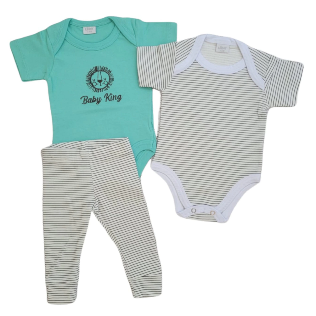 Set de 3 piezas confeccionado en 100% algodónContiene :1 body bordado + 1 body estampado quetienen broches metálicos niquelados hipoalergénicos.1 pantaloncito estampado, que se puede combinar con los dos bodys.