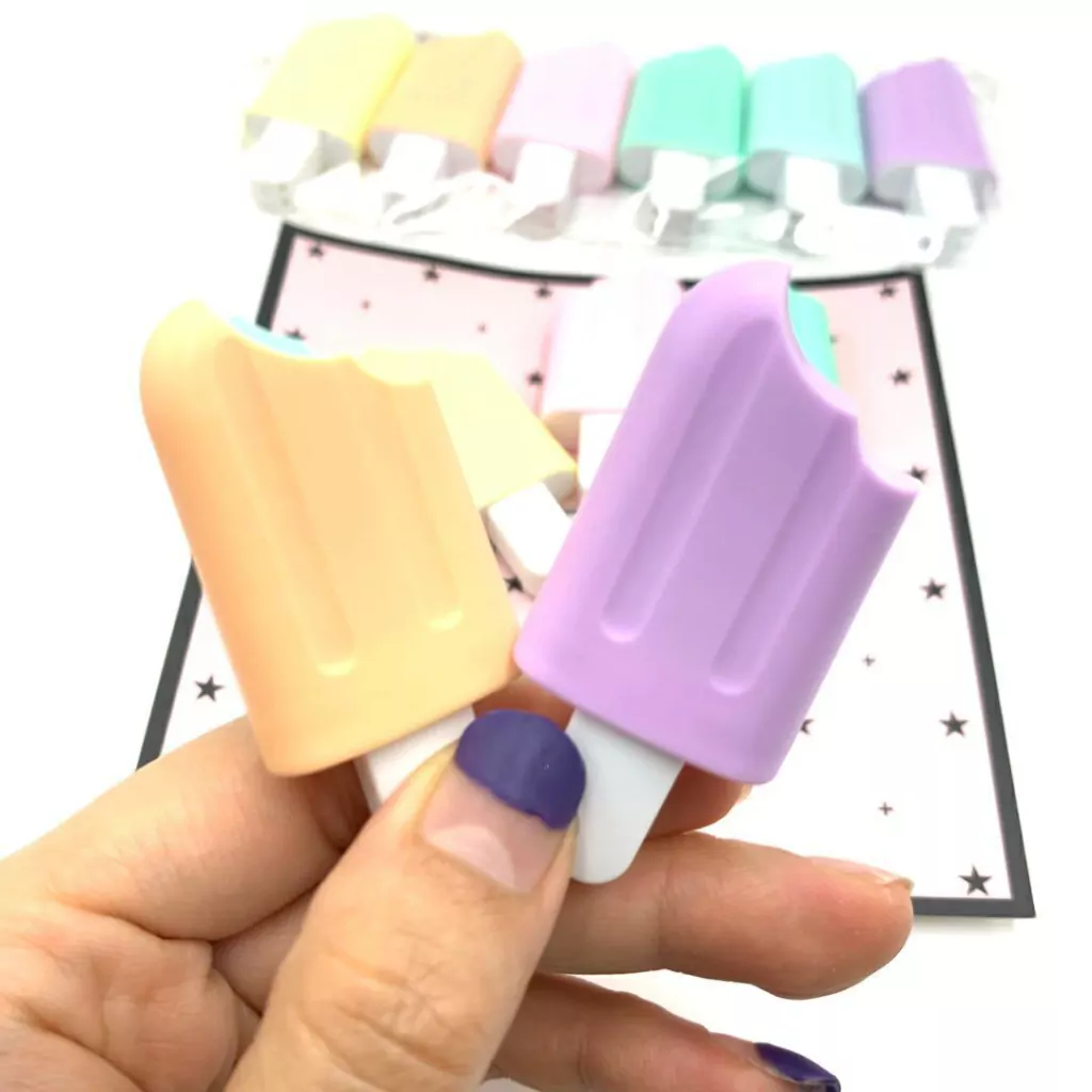 Sobre transparente con 6 resaltadores de colores pastel con forma de heladito