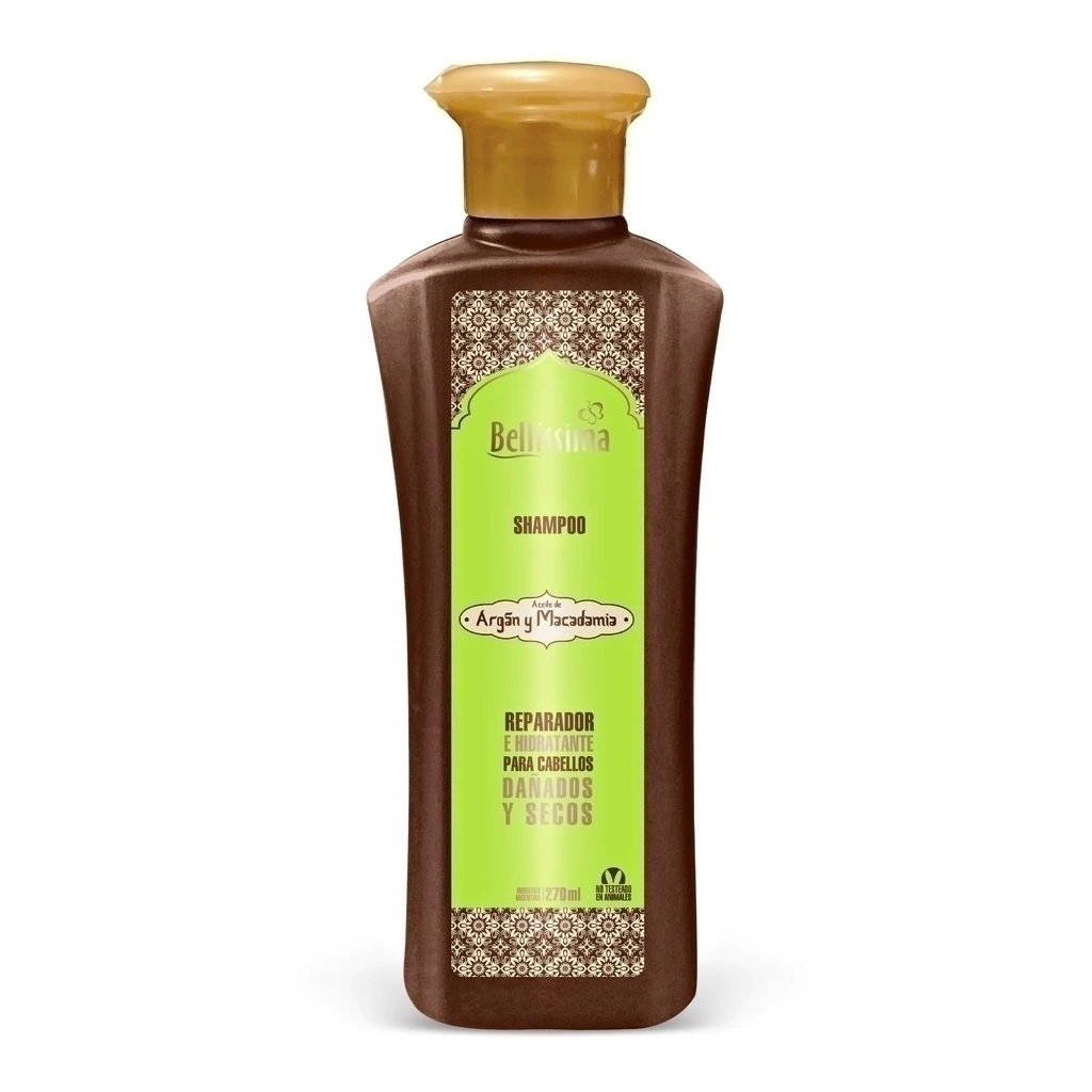 Shampoo con aceite de argan y macadamia - BellissimaReparadorHidratantePara cabellos dañados y secosLimpia suavemente el cabello aportando los nutrientes necesarios para reparar e hidratar la fibra capilar. Dejando un brillo y suavidad increibles.Modo de uso:Aplicar sobre cabello humedo y masajear desde el cuero cabelludo hacia las puntas. Enjuagar y repetir el proceso en caso de ser necesario.Presentacion:270 ml