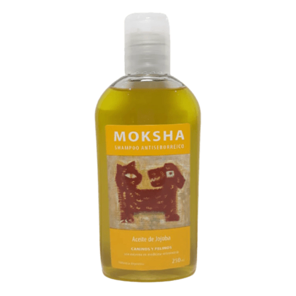 Shampoo MOKSHAantiseborreicopara caninos y felinosCant: x 250ml.Contiene aceite de jojoba.