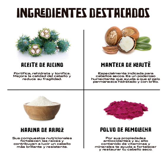 Con aceite de ricino, manteca de karité y harina de arroz. Sus compuestos nutricionales fortalecen las raíces, mejoran la calidad del cabello y reducen su fragilidad. Especialmente indicado para cabellos secos. Es un poderoso humectante que ayuda a que el pelo permanezca hidratado y con brillo.