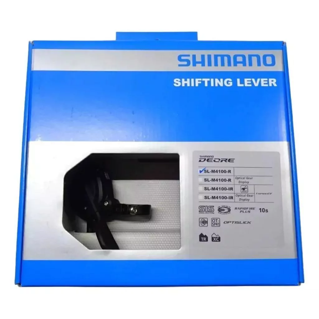 Shifter 10Vel. Shimano Deore M4100 Sin VisorEl shifter Shimano Deore SL-M4100-I para MTB o trekking de 10 velocidades tiene una fijación I-Spec EV, por lo que está pensada para ser combinada con una palanca de frenos adecuada. Esto permite que el cockpit de mando se diseñe de forma individual y ergonómica. Como maneta de cambios Rapidfire-Plus, el SL-M4100-I cuenta con una función 2-Way-Release, es decir, el cable de cambios puede liberarse presionando con el pulgar o tirando con el dedo índice. Se incluye un cable interior y una funda OT-SP41.Especificaciones:Modelo: 4100-IR con sin visorPeso: 134gr (con cable)Transmisiones: 10 velocidadesDatos técnicos:Tipo: Rapidfire Plus 2025 mm interno sin visor de velocidadesMaterial carcasa: AluminioMaterial palanca: Plástico, acero (palanca principal), resina sintética, acero (palanca de liberación)Cable: Acero (Optislick)Funda de cable: OT-SP41SP41 sellado Externo (1880mm)6mm selladoOpciones de ajuste:– Ajuste cable– Ajuste de posiciónCaracterísticas:– un acceso más rápido y un cambio suave– I-Spec EV: rango de ajuste de 14 mm– número máximo de marchas por cambio: 3 (palanca principal, trasera)– compatible con sistemas de cambios MTB de 10 velocidades– cable interior Optislick con un recubrimiento galvánico mínimo y uniforme para una guía de cables más eficiente y una mayor resistencia a la corrosión– carcasa barnizada– tornillo de fijación de acero inoxidable