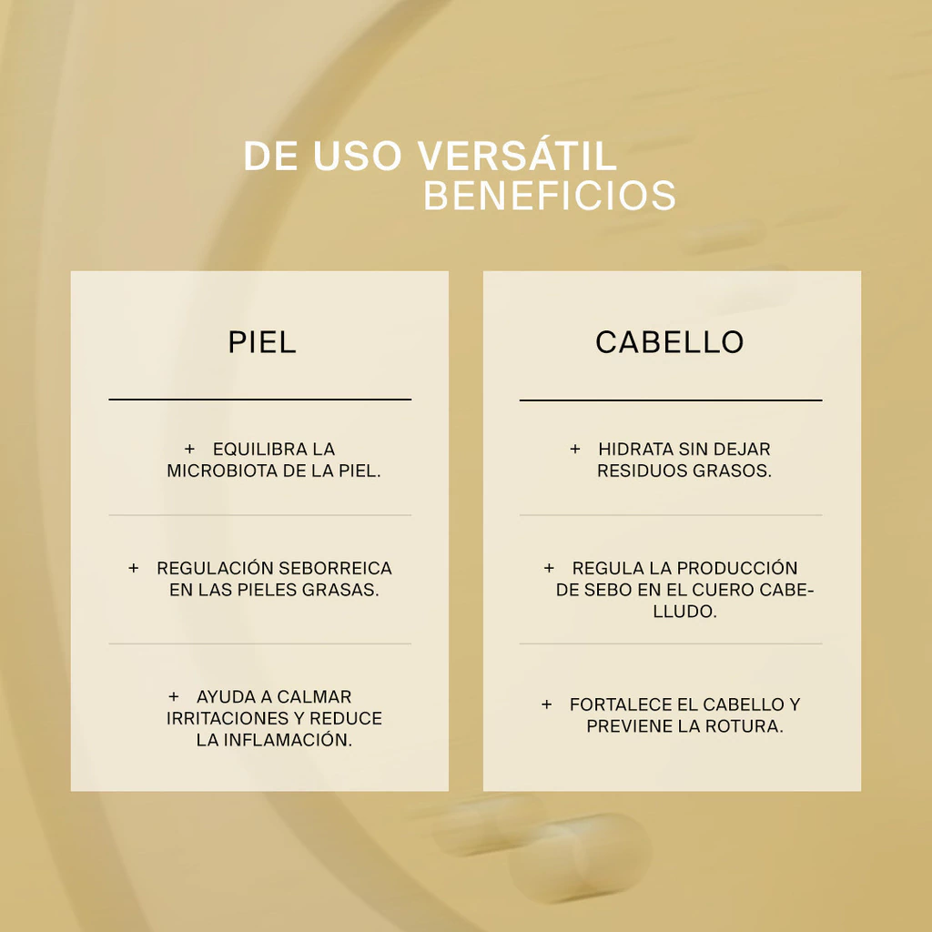 - Durante el día: Actúa como controlador del sebo, manteniendo la piel y el cuero cabelludo frescos y libres de exceso de grasa.