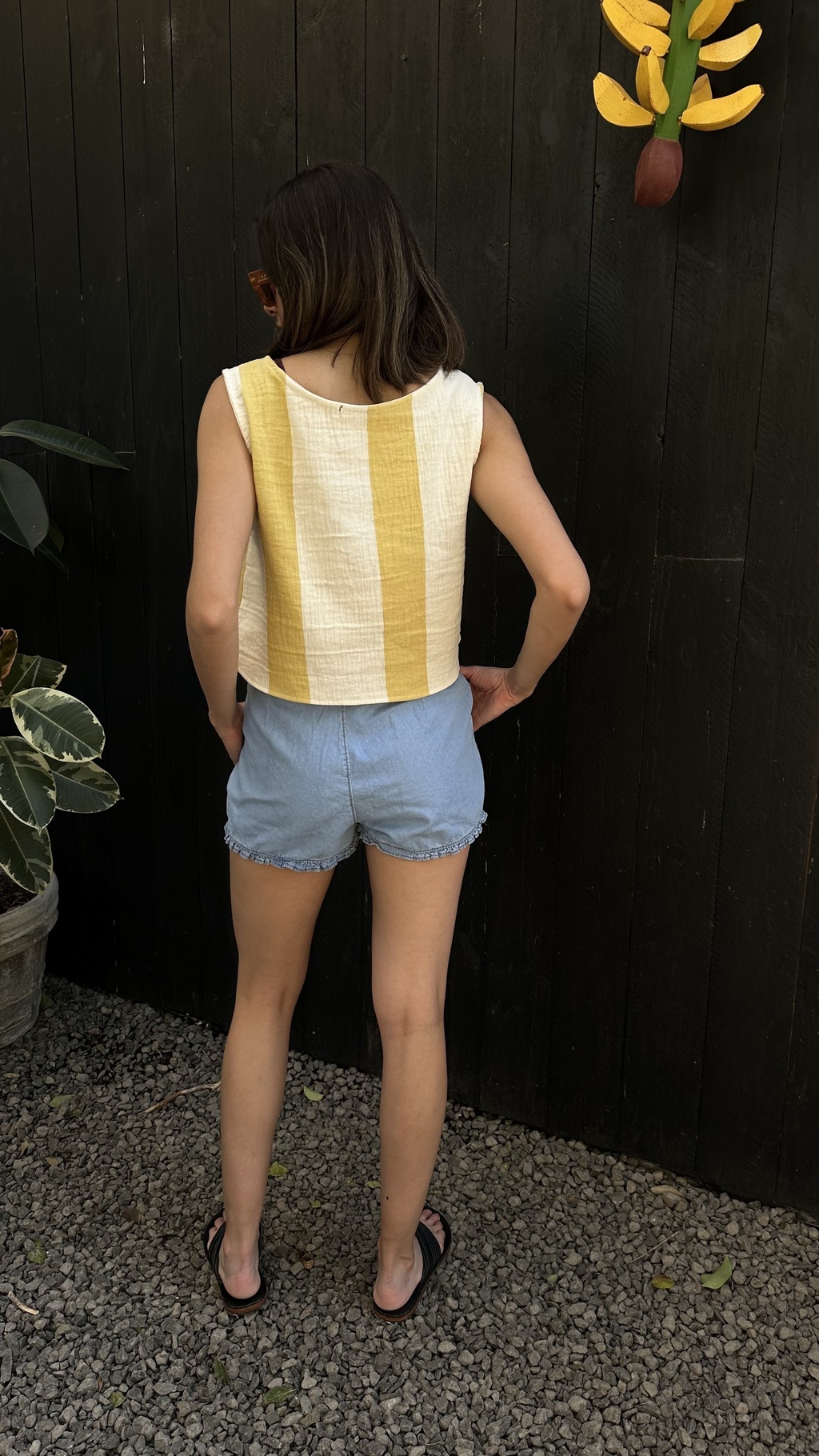 Short de jean liviano con voladitos en los bolsillos y piernas, cinturas con lazo regulable tipo papaer bag