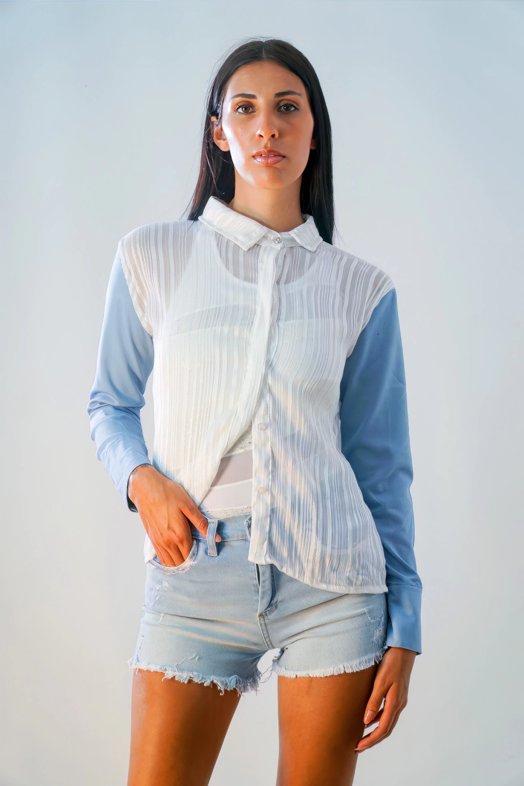 Short denim celeste tiro alto, con aplicación de foil plata en bolsillos y pintura de rayo blanco en bolsillos traseros.
