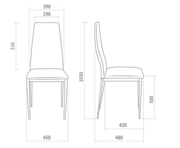 Respaldo de curvas envolventes Tapizado en tela o ecocuero Asiento de espuma de alta densidad Estructura cromada con patas cónicas de 1″ de diámetro.